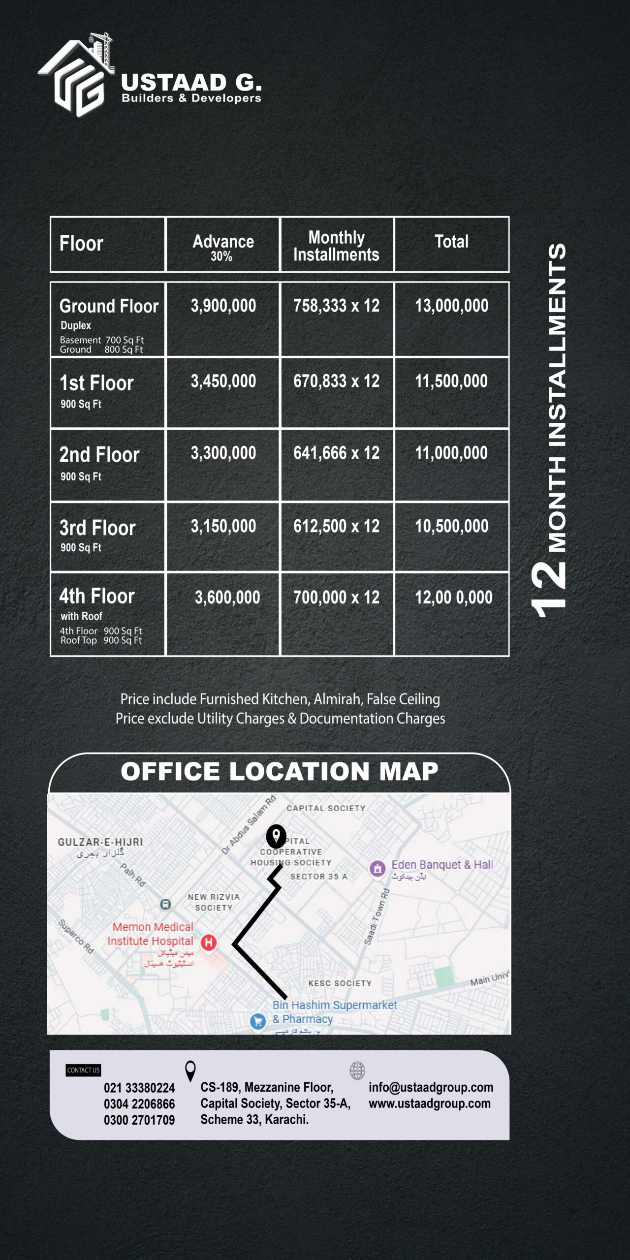 Highlights: Ground + 4 Floors (4th with roof access) Spacious 900 sq. ft. apartments & duplex option Flexible 12-month installment plan with 30% advance Prime location in Scheme 33, Karachi. A perfect choice for families & investors seeking long-term value.